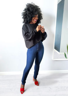 The classic high waist skinny jeans has five pockets. The material is a blend of cotton, polyester, and spandex for a stretchy fit.